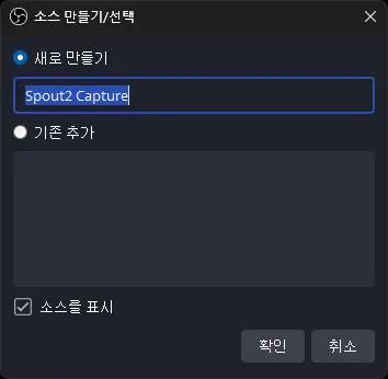 소스 목록 → Spout2 Capture 선택 → 소스 만들기