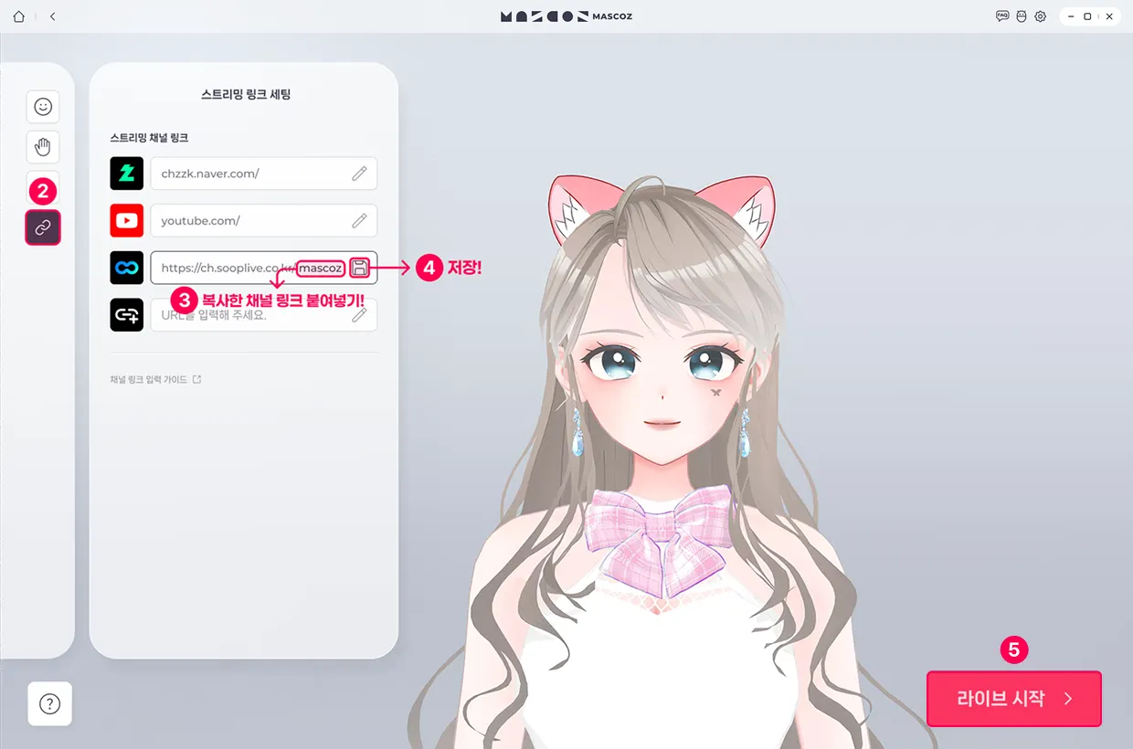 마스코즈에 로그인한 후 방송 세팅를 실행해주세요. 그리고 아래 단계를 진행해주시면 방송 채널 등록 끝