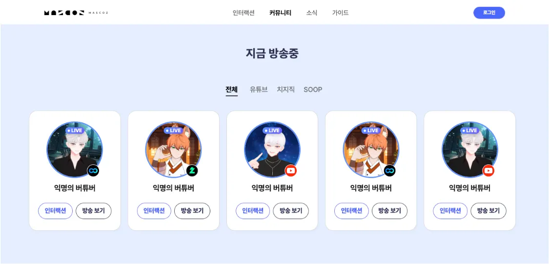라이브 방송을 키면 마스코즈 홈페이지(커뮤니티)에 내 방송 채널 이미지와 이름이 자동으로 홍보 돼요